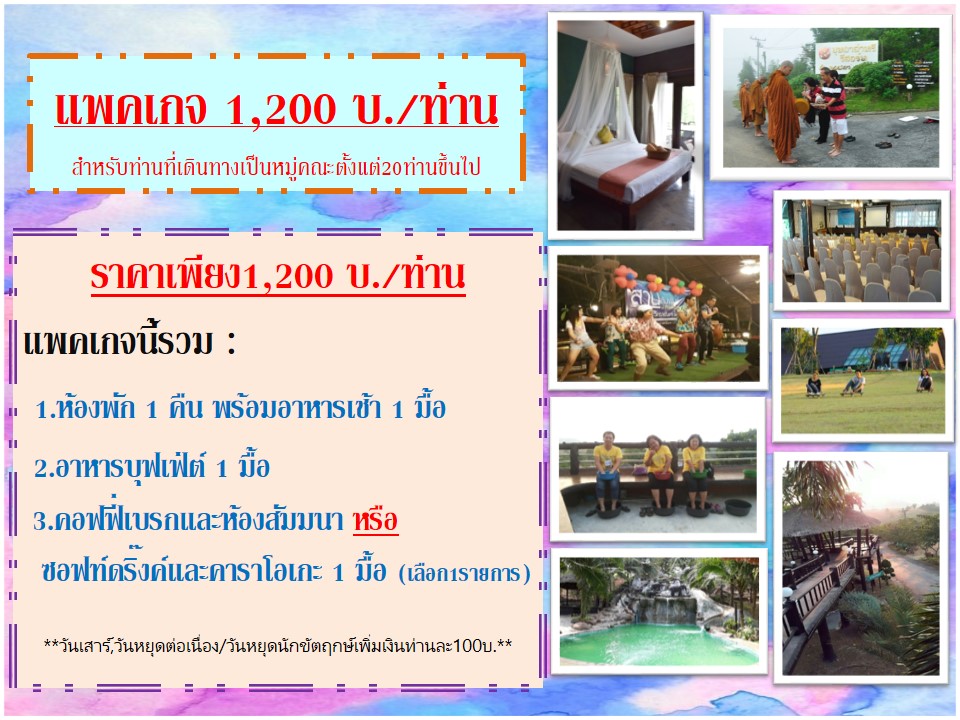 แพคเกจสุดคุ้มสำหรับท่านที่เดินทางเป็นหมู่คณะตั้งแต่ 20 ท่านขึ้นไป ในวันธรรมดา (อาทิตย์ – ศุกร์)ราคาเพียง 1,200บ.ท่าน เริ่มตั้งแต่ 1ตุลาคม 2559 – 28 กุมภาพันธ์ 2560 ยกเว้นวันเสาร์, วันหยุดนักขัตฤกษ์ และ เดือนธันวาคม2559 ที่งดร่วมรายการ
