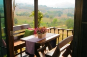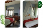 จุดเด่น : การตกแต่งเน้นความโปร่งสบาย อากาศถ่ายเท เราเลือกใช้วัสดุที่แข็งแรง เน้นงานไม้และงานปูนเปลือย เพื่อให้สอดคล้องกับบรรยากาศท่ามกลางธรรมชาติ ระเบียงบ้านเห็นวิวสวยงาม วิวภูเขาปรับเปลี่ยนตามฤดูกาล ทอดแนวเทือกเขาแผงม้าพาโนราม่า และยังชมวิวพระอาทิตย์ตกดินได้ในเวลาพลบค่ำ ห้องน้ำมีพื้นที่กว้าง และส่วน Shower เป็นแบบเปิดโล่งแยกเป็นสัดส่วน ภายในห้องมีเตียงนอนขนาด 6 ฟุต